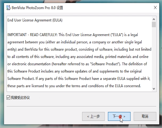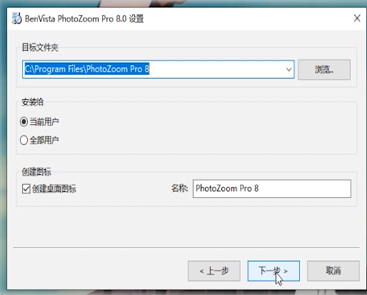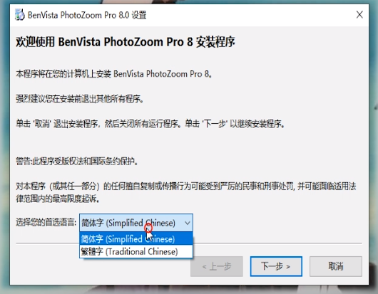 点击下载试用,弹出下载窗口,选择默认D盘点击下载,等待下载完成,下载完成之后点击桌面上的PhotoZoom_Pro_8_win安装包,弹出BenVista PhotoZoom Pro 8 安装程序窗口,提示您软件将在电脑中安装下载,这里有两种语言选择,软件自动选择简体中文,您可以自主选择其他,完成后点击下一步。