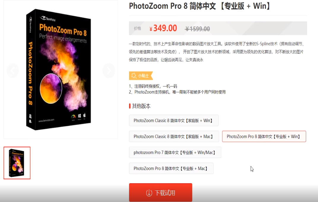 下载页面有五个版本,选择您自己需要的版本下载,小编这里选择PhotoZoom Pro 8 简体中文 【专业版 + Win】下载。
