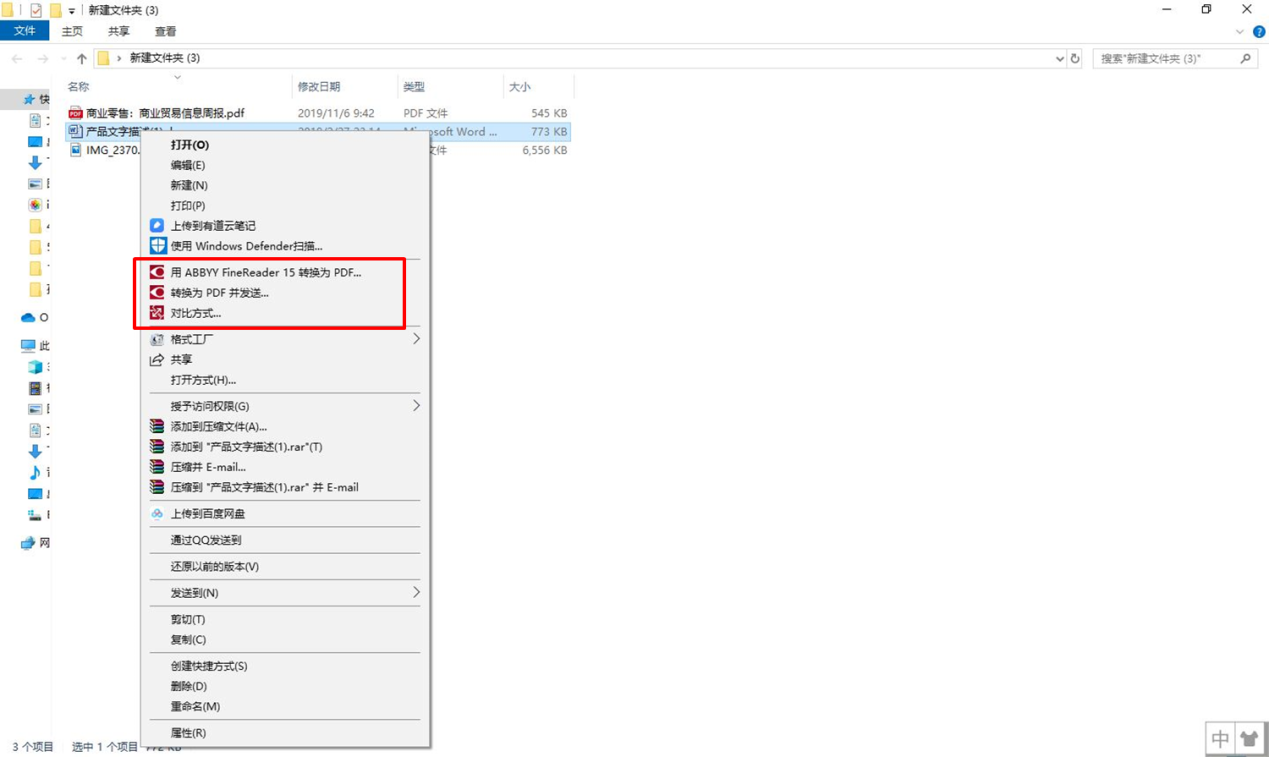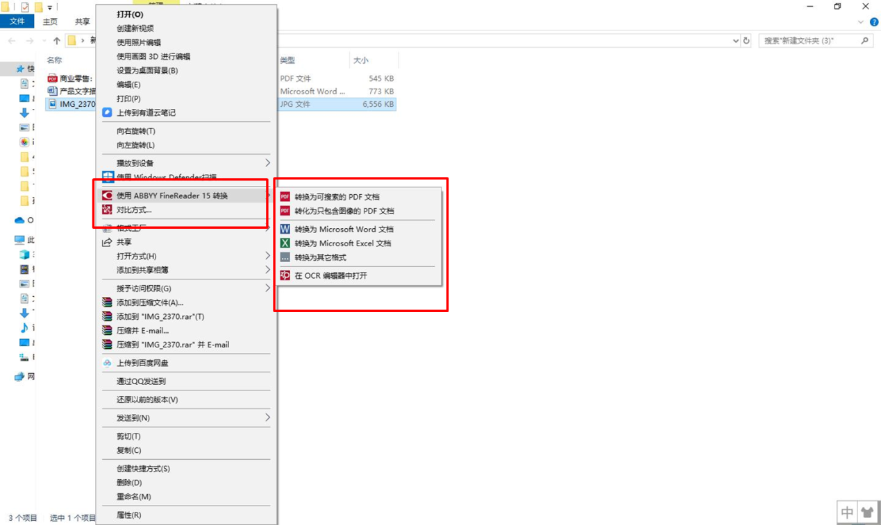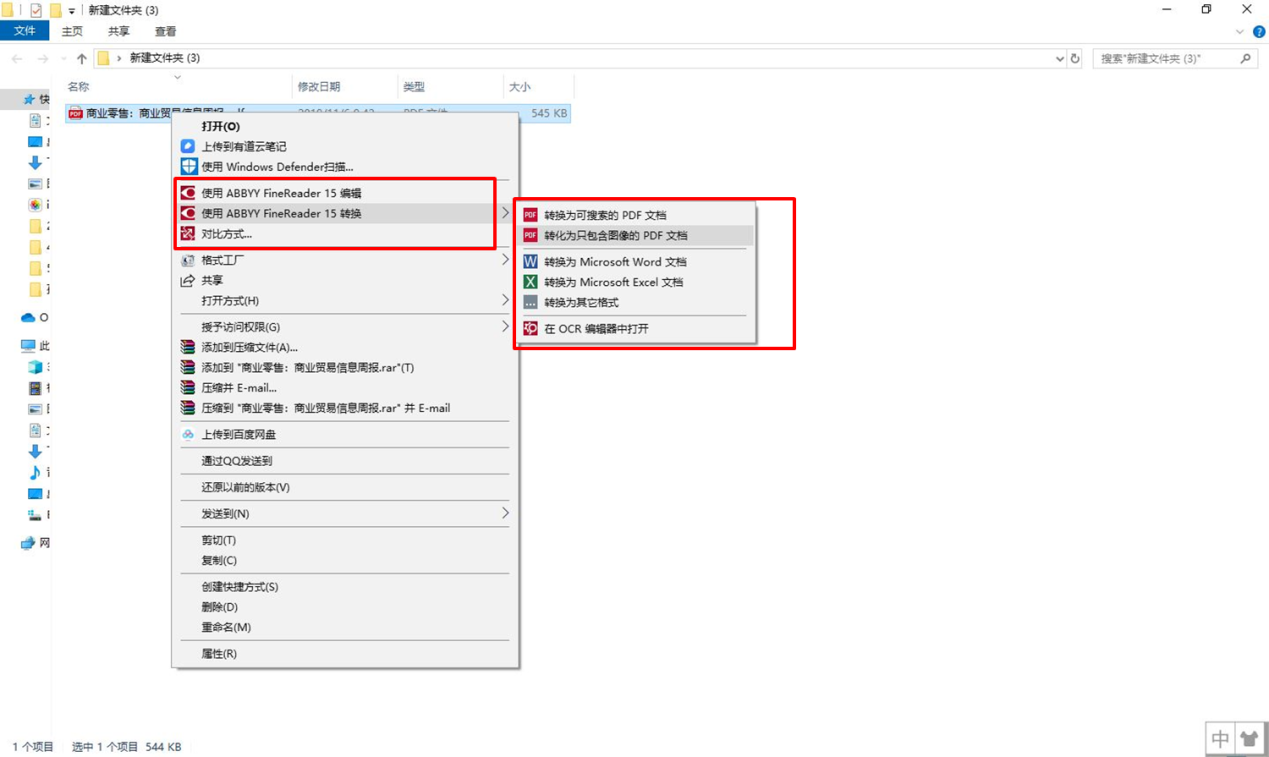 ABBYY FineReader 15(Windows系统)与 Windows 资源管理器的集成使用后,在不打开软件的情况下,可通过右击启动快捷菜单开启。