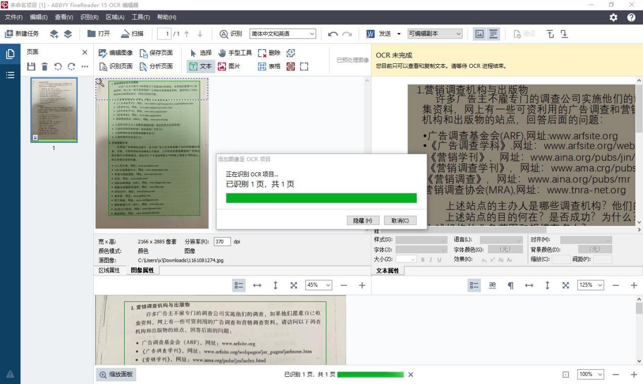 在识别文档前,用户需将文档导入到ABBYY FineReader 15 的OCR编辑器中。在下图示例中,当我们将一张图片导入到OCR编辑器时,软件就开启了自动识别功能。识别过程中会花费一点时间,文档内容越多,识别的时间也越长。