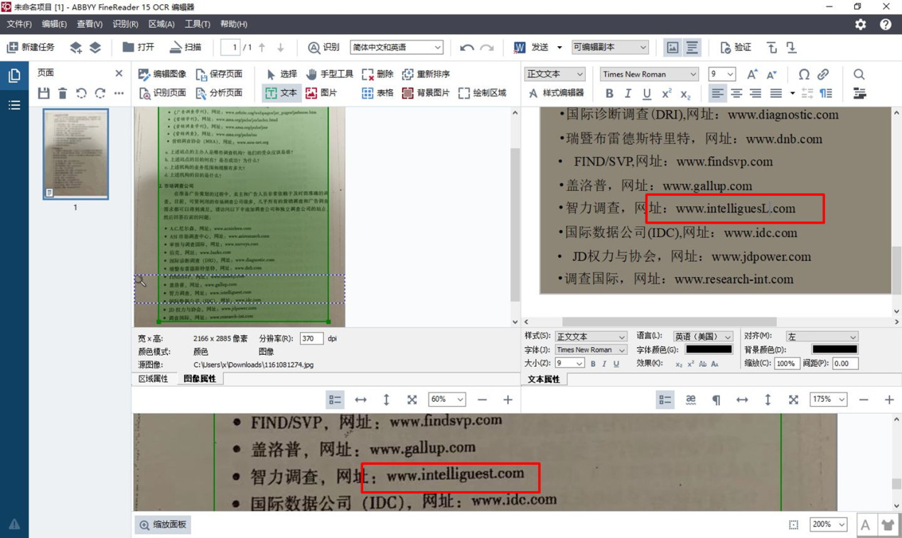 当ABBYY FineReader 15 完成识别后,用户可在图像面板、文本面板、缩放面板中预览到识别的结果。在下图示例中,我们发现其中一个单词出现识别错误。鉴于这种情况,我们可将此单词添加入用户词典中提高识别准确度。