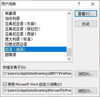 打开ABBYY FineReader 15 “工具”菜单,并单击“查看词典”,并在“用户词典”的对话框中选择需要加入的词典语种,然后单击“查看”进一步添加单词。