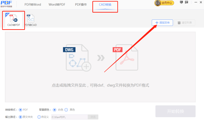2.进入到转换功能界面之后,我们在其中选中CAD转换,选择CAD转PDF这个功能之后点击右边的添加文件按钮。
