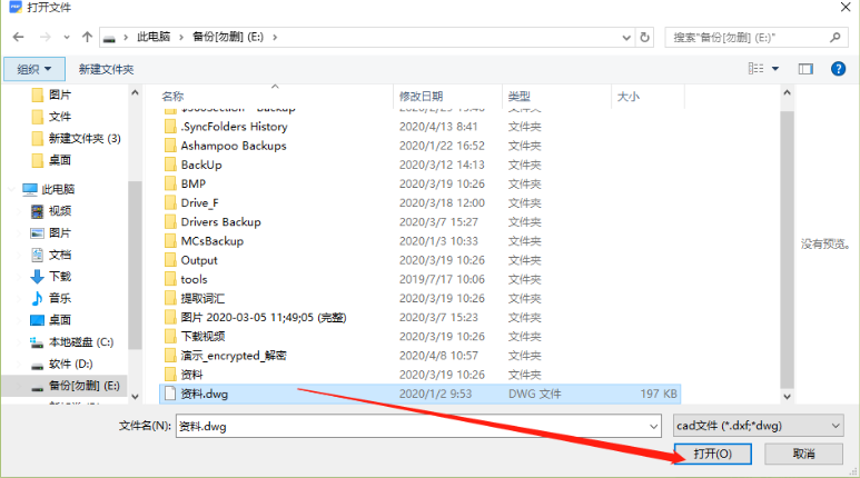 3.点击添加文件按钮之后,接下来就打开一个选择文件的界面了,在这个界面中我们选中目标CAD文件之后点击打开按钮。