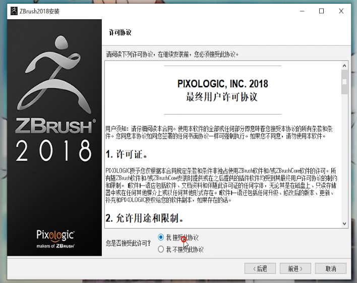 弹出许可协议窗口,详细阅读协议内容后,点击我接受许可协议,完成后点击前进