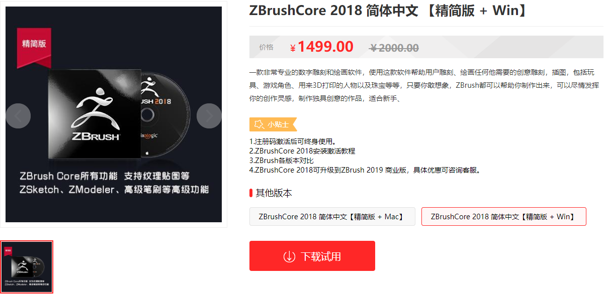 下载页面有两个版本,选择您自己需要的版本下载,小编这里选择ZBrushCore 2018 简体中文 【精简版 + Win】下载