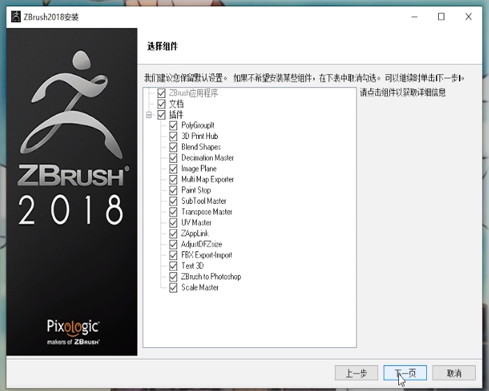 弹出选择组件窗口,软件提示您保留默认设置,如果不希望安装某些组件,在组件小窗中取消勾线,完成后点击下一页