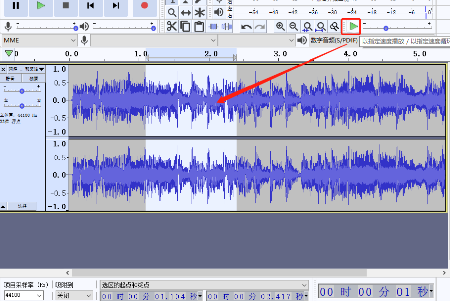 6.点击确定按钮音效就设置成功了,我们点击界面右上角的绿色播放按钮可以播放处理过的这个音频片段试听效果。