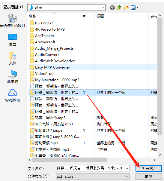 2.点击打开之后会出现一个选择文件的界面,我们在其中选择想要处理的音频文件,选中之后点击打开按钮即可。
