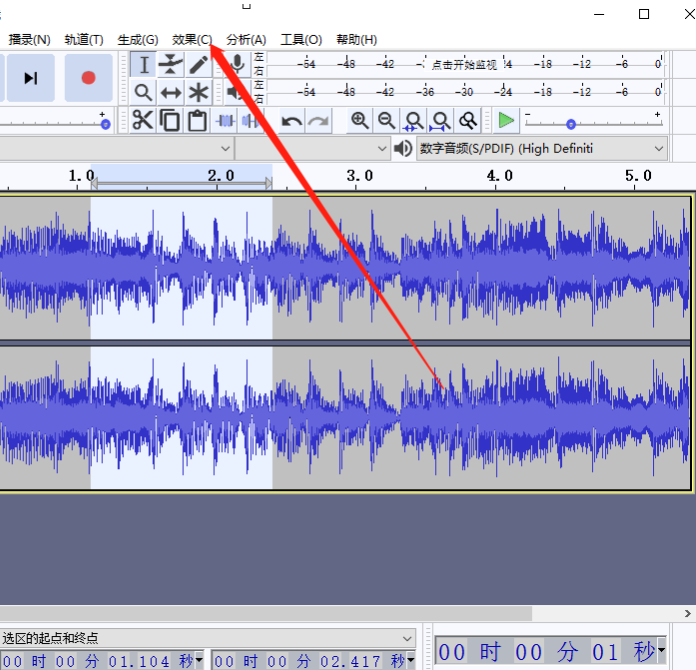 3.点击打开按钮之后我们在出现的音频轨道中,按住鼠标左键拖动来选择想要编辑音效的音频片段,选择之后点击上方的效果选项。