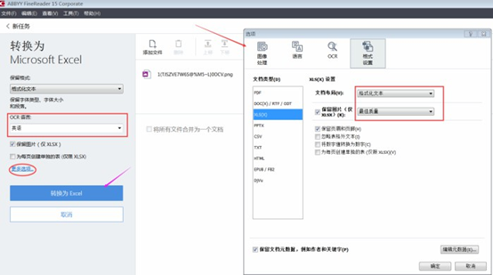 设置转换选项,如图4所示界面。主要是设置好“格式化文本”和语言类型,如果需要更多设置,可以点击“更多选选项”(图4中红色圈中处),右侧的窗口就是详细的设置界面。设置妥当之后,点击蓝色“转换为Excel”按钮,就开始转换了。