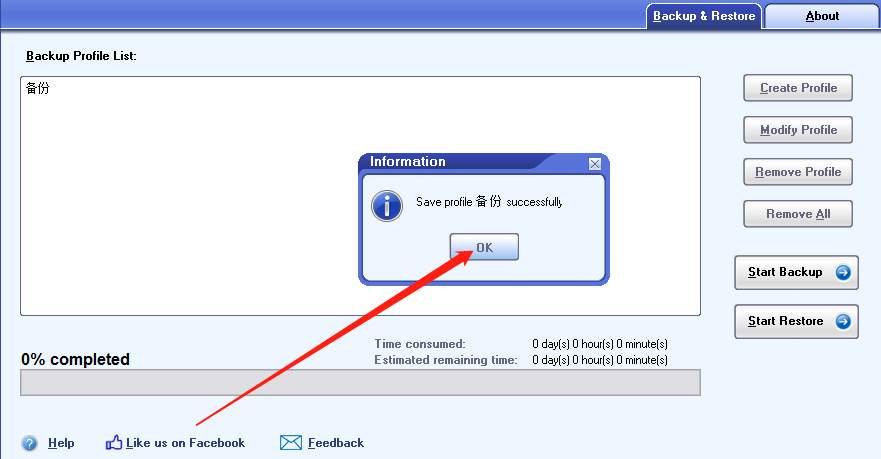 7.点击OK按钮之后界面中会出现一个备份任务储存成功的提示,我们点击OK按钮即可。