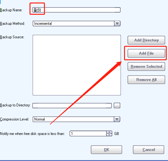 2.点击创建任务之后就会大家一个备份任务参数设置的界面,我们在第一个输入框中输入这个备份任务的名称,然后点击Add File这个添加文件按钮。