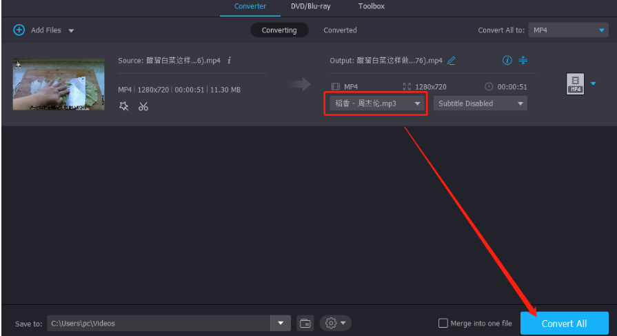 6.最后将音频选择为添加的这个音频文件之后,点击右下角的Convert这个转换按钮就可以将它转换出来并保存视频了。