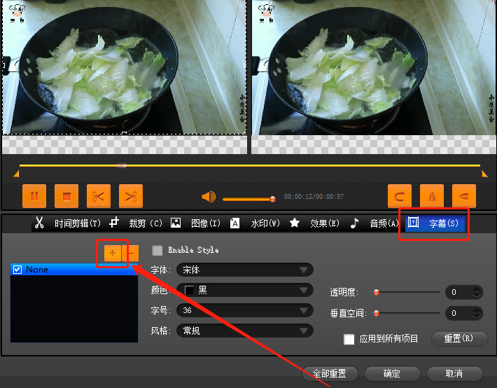 4.点击编辑字幕按钮之后进入到软件的视频编辑界面,在字幕编辑界面点击左下角的添加图标,如下图中所示。