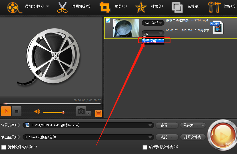 3.点击打开按钮之后我们就将视频添加到软件主界面了,在界面中找到字幕选项,打开下拉列表之后选择编辑字幕按钮。