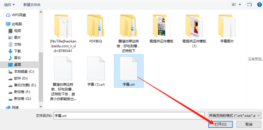 5.点击这个添加图标之后,在出现的选择文件界面中就可以选择想要添加的字幕文件了,点击右下角的打开按钮即可。