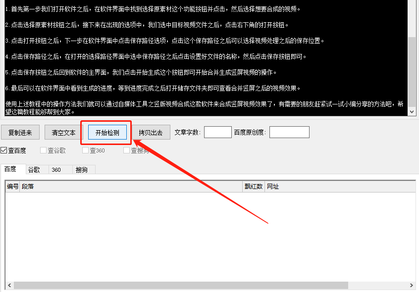 3.点击开始检测之后在下方可以看到一些句子的检测结果,等到最后检测完成可以看到文章的总字数和百度原创度数据了,如下图中所示。