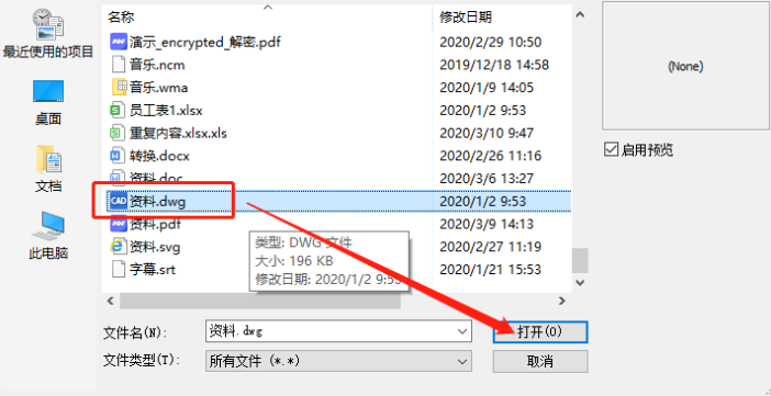 2.点击这个打开选项之后,我们就会来到选择文件的界面了,在这个界面中我们选中目标dwg格式的文件之后,点击右下角的打开按钮。