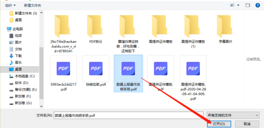 2.点击打开之后会出现一个选择文件的界面,在选择文件的界面中选中想要转换的PDF文件之后点击右下角的打开按钮。