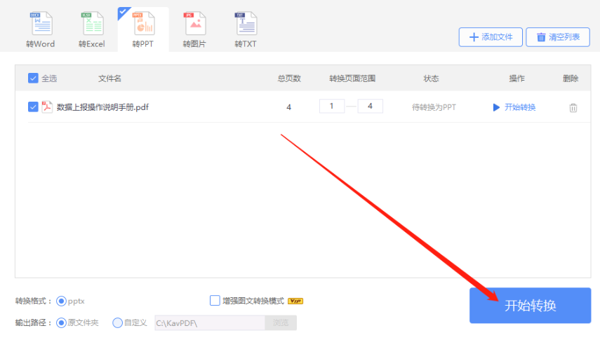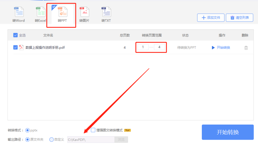 5.最后设置好转换范围和输出路径之后,我们点击界面右下角的开始转换按钮就可以开始转换PDF文件为PPT文件的操作了。