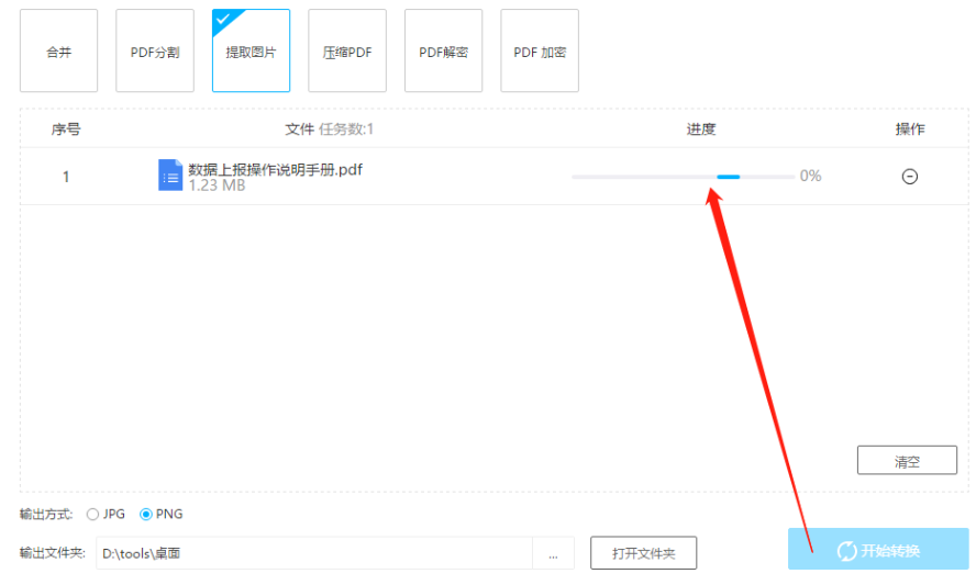 5.选择好保存图片的位置之后点击右下角的开始转换按钮即可开始提取操作,界面中可以看到操作进度。