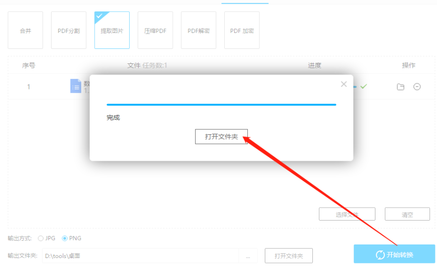6.最后一步我们在提取图片的操作完成之后,在出现的完成提示界面,点击打开文件夹按钮即可进行查看。