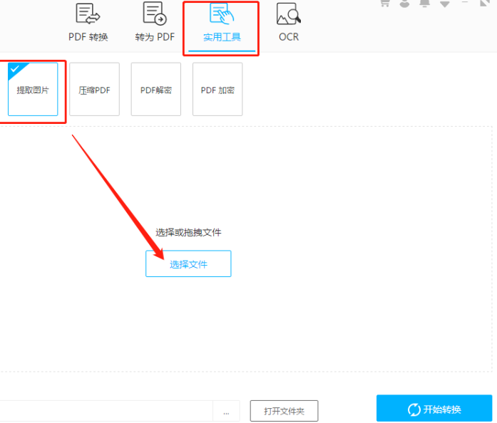 1.首先第一步我们打开软件之后在软件界面上方点击使用工具选项,点击之后选中提取图片功能,然后点击界面中的选择文件按钮。