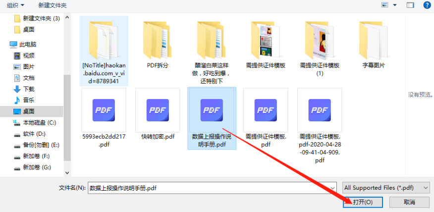 2.点击选择文件按钮之后就会打开一个选择文件的界面了,我们选中想要提取图片的PDF文件之后,点击右下角的打开按钮。