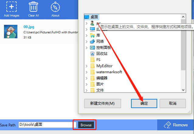 3.点击打开按钮之后图片就成功添加到软件界面了,然后我们点击下方的Browse这个浏览按钮,然后在出现的界面中选择想要保存抠图的位置并点击确定按钮。