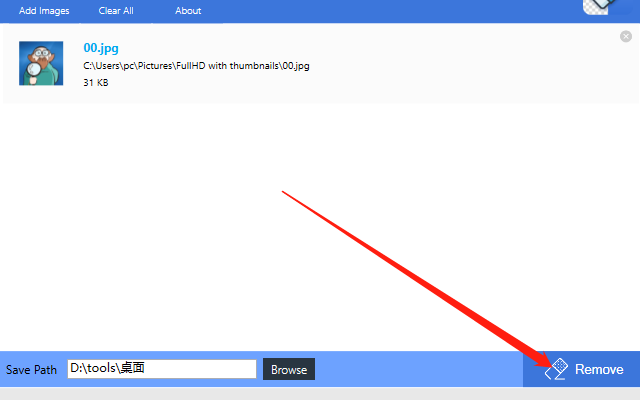 4.点击确定按钮设置好图片输出保存路径之后,我们点击界面右下角的Remove这个按钮准备开始抠图操作。