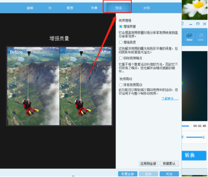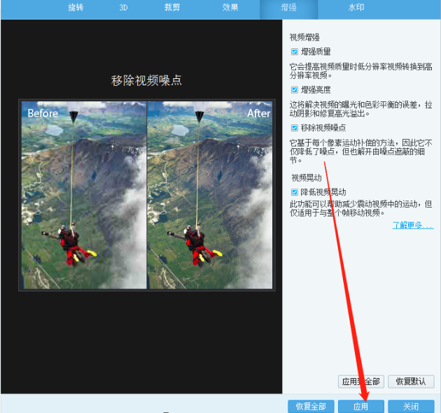 5.点击增强这个模块之后我们可以勾选视频增强、增强亮度、降噪、降低视频晃动这些选项,根据视频的具体需求进行勾选之后点击应用按钮。