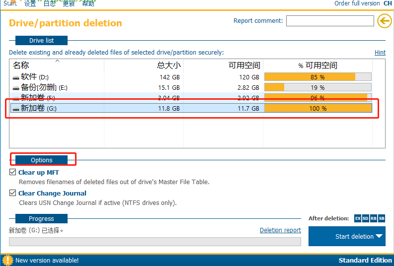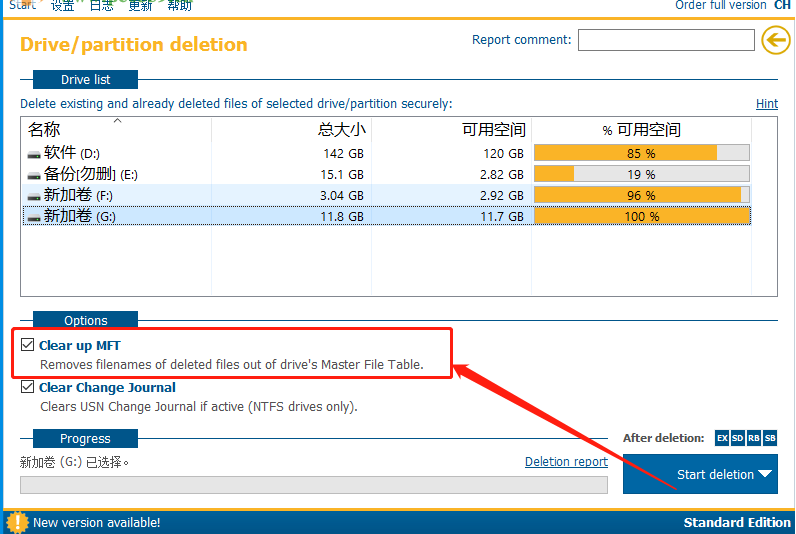 3.在选项模块中,第一个Clear up MFT这个功能表示的意思是“从驱动器的主文件表中删除已删除文件的文件名”,我们需要勾选这个选项。