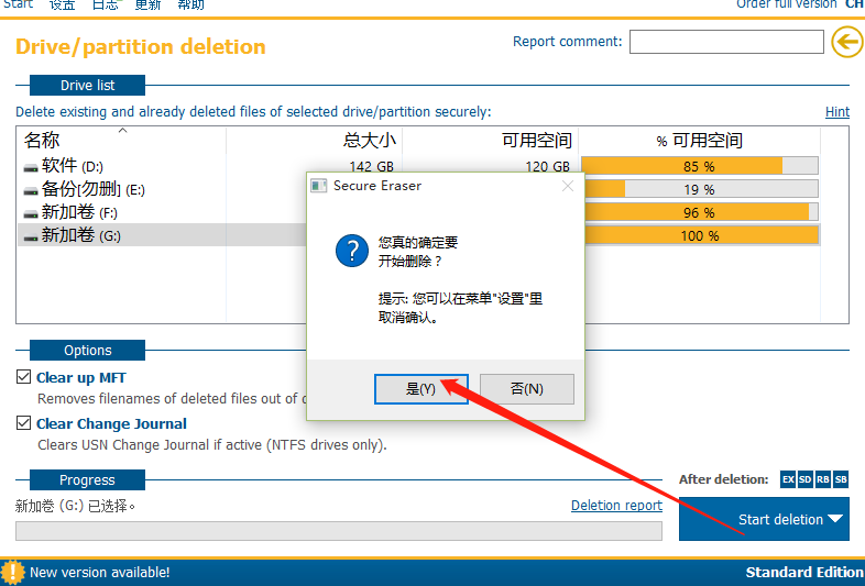 5.勾选这两个选项设置之后,点击界面右下角的Start deletion按钮就可以开始删除了,点击之后在出现的界面中点击“是”按钮即可。