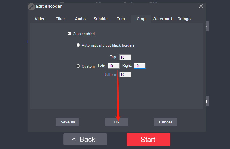 6.勾选之后点击选择Custom这个选项就可以对裁剪尺寸的上下左右宽度进行设置了,用户根据自己想要裁剪的尺寸输入之后点击下方的OK按钮。