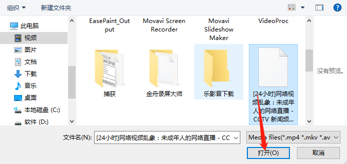 2.点击这个添加视频模块之后会出现一个选择视频文件的界面,在这个界面中我们选中想要裁剪的视频之后点击打开按钮。