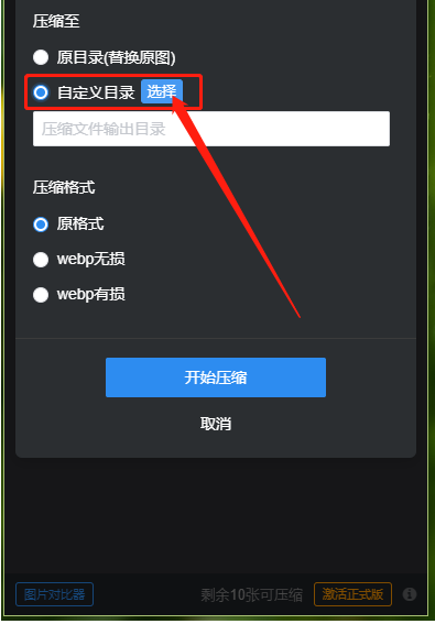 3.移动到自定义压缩格式和输出目录的压缩方式界面之后,我们选中自定义目录选项,点击选择按钮即可选择目录。