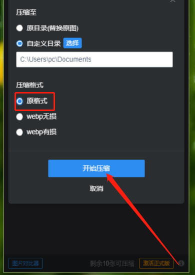5.点击选择好输出目录之后,我们在压缩格式这个位置选择自己需要的选项,小编就选择原格式,选择之后点击界面中的开始压缩按钮就可以开始批量压缩的操作了。