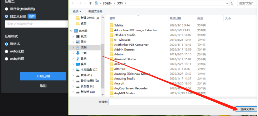 4.点击选择按钮之后下一步是需要在打开的选择路径界面中选择自己想要保存压缩文件的位置,选中之后点击选择文件夹按钮。