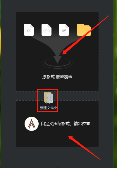 2.将文件夹拖动到软件界面之后我们就可以看到界面中有两种压缩模式了,有“原格式原地覆盖”的方式和自定义压缩格式的方式,然后我们移动到自定义压缩这个模块中。