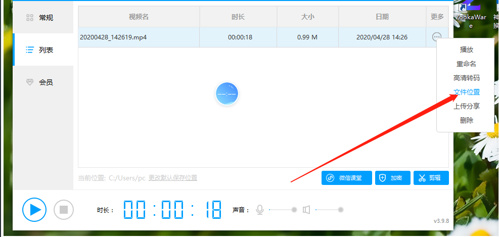 5.停止录制之后会自动回到软件界面,然后在列表这个模块就可以看到录制之后的视频文件了,点击最右边的三点图标在出现的选项中点击文件位置选项即可打开录制视频储存的文件夹。