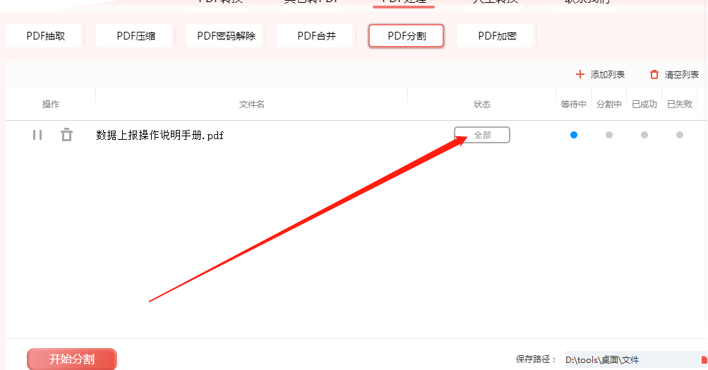4.点击打开按钮之后在界面中即可看到添加进来的PDF文件,然后在状态这一栏点击全部这个按钮即可设置分割的页数。