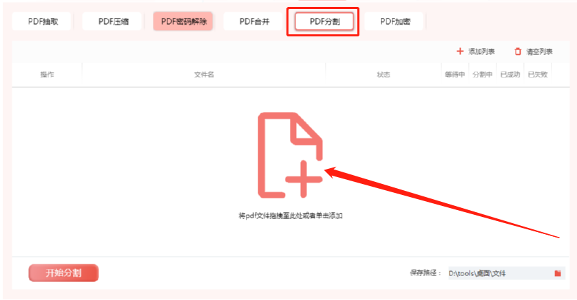 2.切换到PDF处理界面之后我们就可以选中PDF分割这个功能了,选中之后点击界面中间的加号。