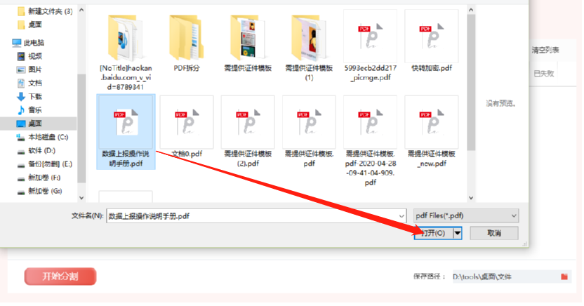 3.点击加号之后我们在出现的选择文件界面中就可以选择想要分割的PDF文件了,选中之后点击右下角的打开按钮。