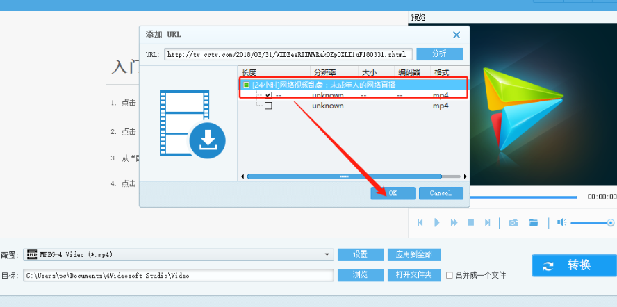 3.点击分析按钮之后软件就会开始分析链接中的视频文件了,我们等待分析完成之后即可看到视频列表,点击选中视频之后点击下方的OK按钮。