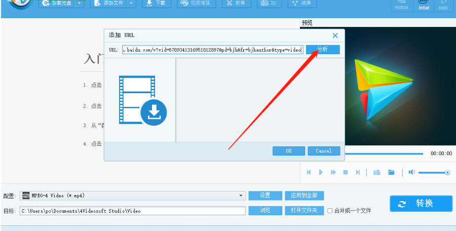 2.打开下载视频的功能界面之后,我们在出现的界面中需要添加下载视频的网页链接,如下图中所示,粘贴链接之后点击分析按钮。