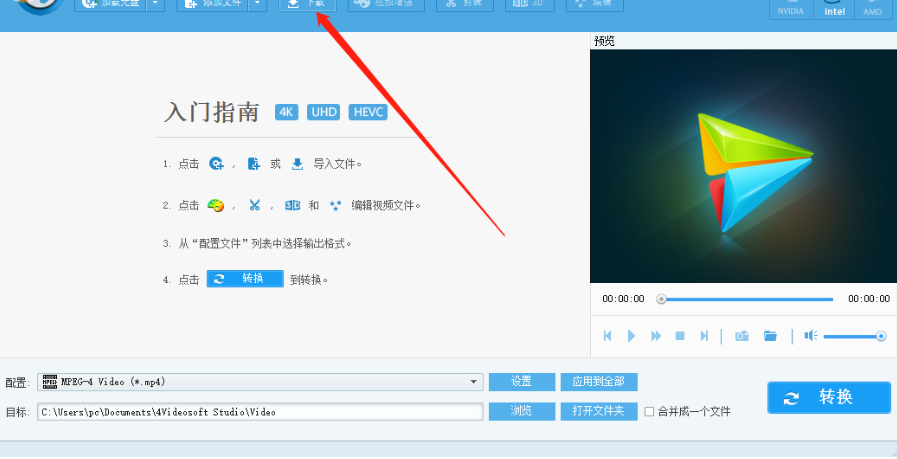 1.首先第一步我们打开软件之后点击界面上方的下载这个功能按钮,点击下载之后打开下载视频的功能界面。