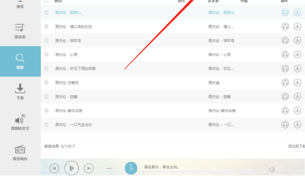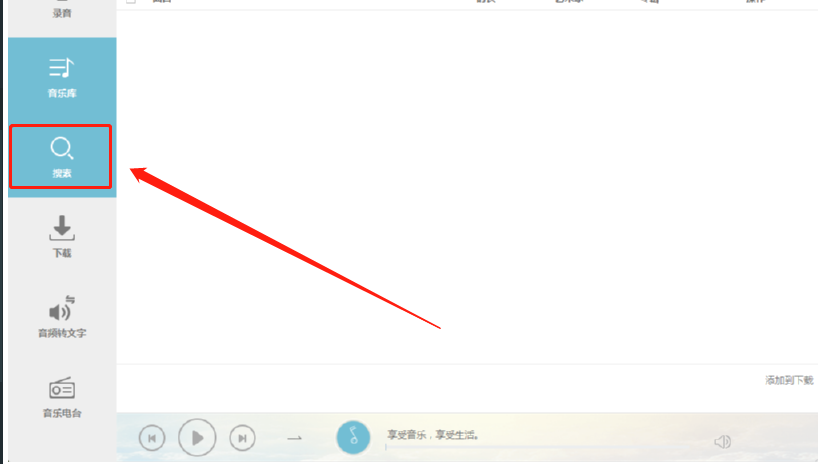 2.切换到搜索界面之后,我们在搜索框中输入想要下载的音乐关键词,输入之后点击右边的搜索图标就可以开始搜索了。