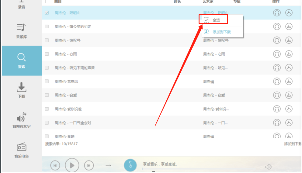 3.等到搜索结果出来之后我们在界面中选中一首音乐,然后用鼠标右键点击它,点击之后就可以点击全选按钮来全部选中这些音乐了。