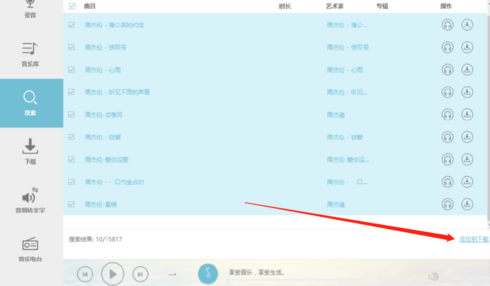 4.另外我们可以点击音乐左边的方框,勾选方框之后即可选中想要下载的音乐,全部选中之后我们点击右下角的添加到下载这个功能按钮即可。